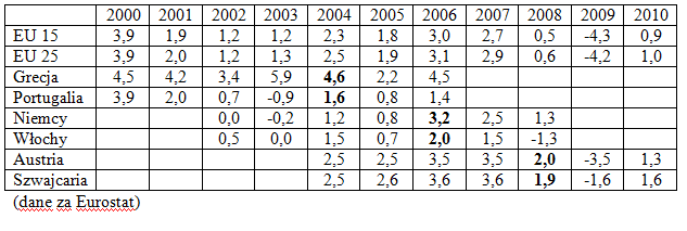 Tabela z danymi dynamiki PKB w latach 2000-2010 dla średniej unijnej oraz krajów organizatorów imprez sportowych – w okresie czterech lat przed imprezą, w roku imprezy oraz dwóch lat po jej przeprowadzeniu. Dane państwa organizatora za rok organizacji imprezy zostały pogrubione.
