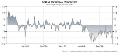 Grecja systematycznie traci tradycyjną bazę przemysłową. Z wykresu wynika, że od przyjęcia Euro do początku kryzysu w 2008 niewielkie wzrosty produkcji przemysłowej miały charakter krótkotrwały i były natychmiast niwelowane przez spadki w kolejnych okresach, zaś od roku 2008 produkcja stale maleje. Konsumenci skierowali się na importowane dobra wyższej jakości, kupowane zwłaszcza w krajach „twardego rdzenia”, zaś eksport grecki nie jest konkurencyjny pod względem ceny jak i jakości. Przystępując do Euro, Grecja wyzbyła się jednego z mechanizmów, do którego często odwoływała się w poprzednich dekadach, czyli osłabiania drachmy. Dewaluacja własnej waluty jest narzędziem słabych gospodarek, i działa w średniookresowej perspektywie, ale jeżeli kraj nie posiada innych zasobów (kapitały, kultura techniczna), to nie należy się go wyzbywać.